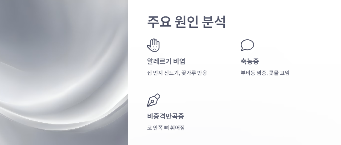 - 알레르기 비염: 집 먼지 진드기, 꽃가루 등 알레르겐에 대한 과민 반응으로 코막힘, 콧물, 재채기 등의 증상이 나타납니다.