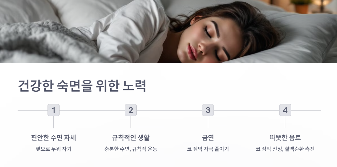 - 편안한 수면 자세: 옆으로 누워 자는 것이 코막힘 완화에 도움이 됩니다.