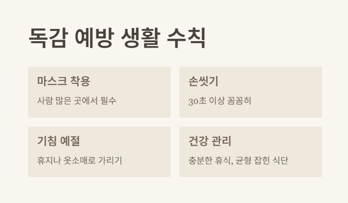 독감 예방을 위해서는 백신 접종 외에도 다음과 같은 생활 수칙을 지켜주세요.