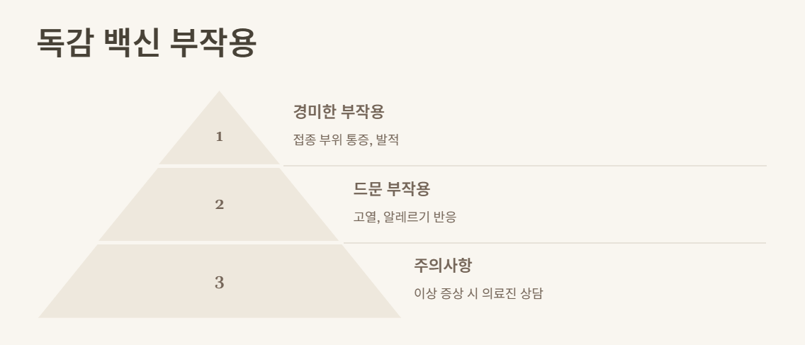 독감 백신 접종 후 팔이 아프거나 붉어지는 등 가벼운 부작용이 나타날 수 있습니다. 드물게 고열, 알레르기 반응 등이 나타날 수 있으므로, 접종 후 이상 증상이 나타나면 의료진과 상담해야 합니다.