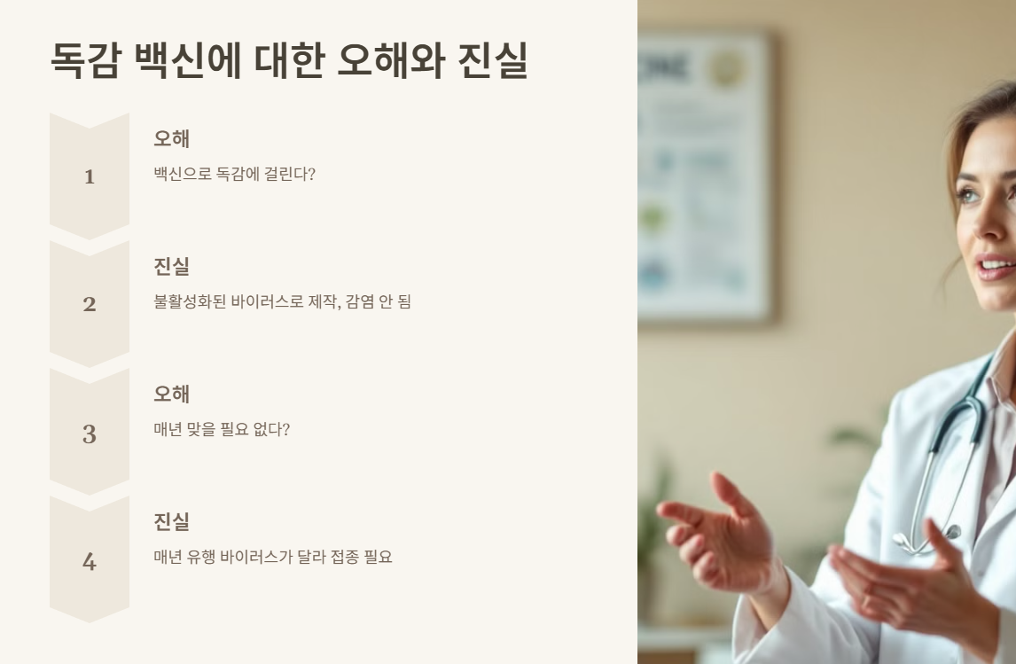- 독감 백신을 맞으면 독감에 걸린다? : 독감 백신은 살아있는 바이러스가 아닌 불활성화된 바이러스나 바이러스의 일부분으로 만들어져 감염을 일으키지 않습니다.