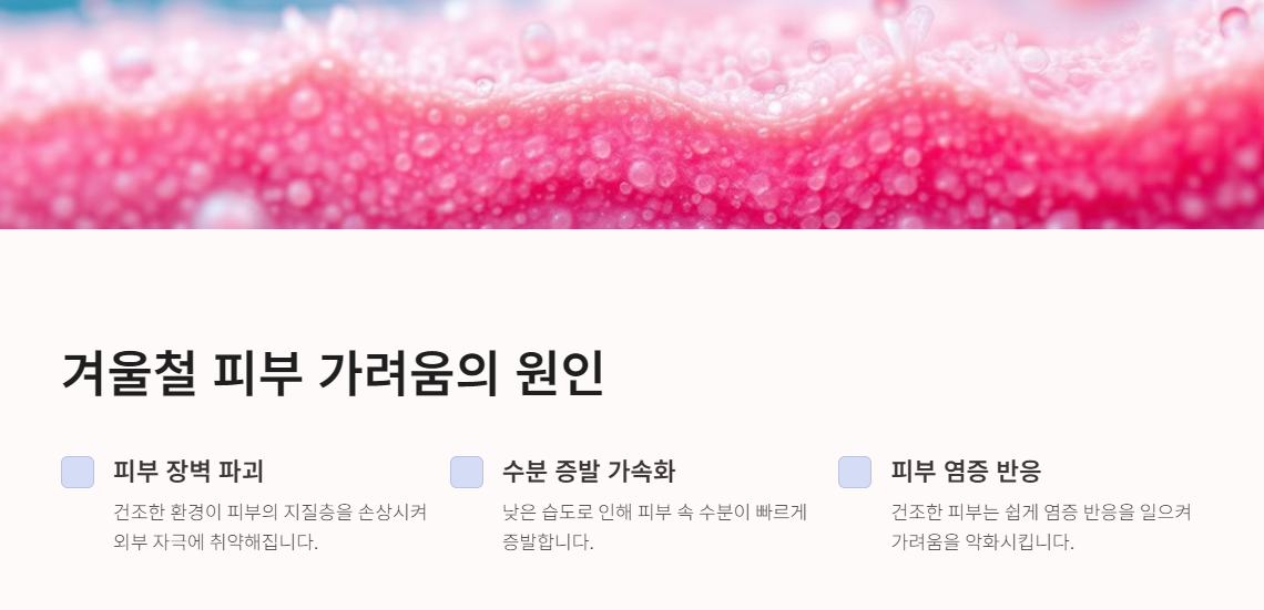 - 피부 장벽 파괴: 건조한 환경은 피부의 보호막 역할을 하는 지질층을 손상시켜 외부 자극에 취약하게 만듭니다.