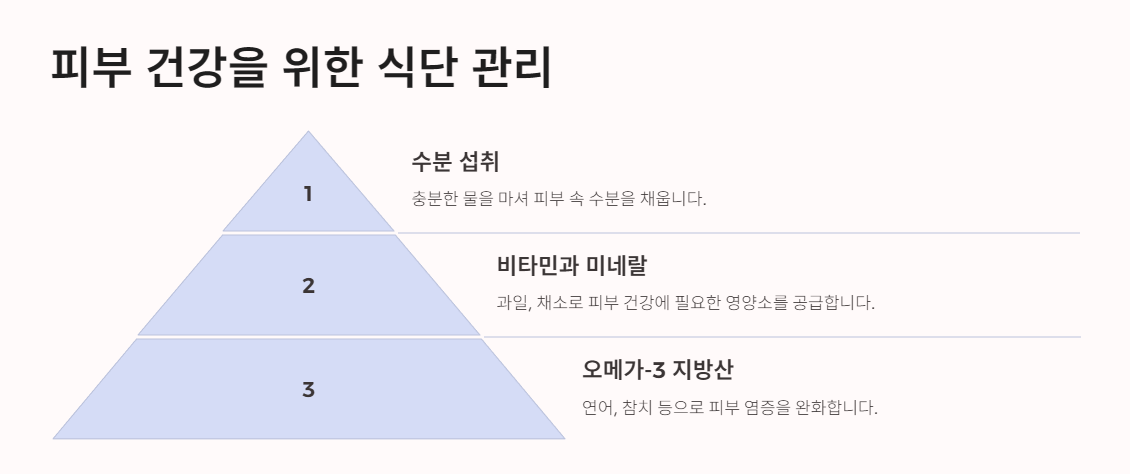 - 비타민과 미네랄 섭취: 과일, 채소 등을 충분히 섭취하여 피부 건강에 필요한 영양소를 공급합니다.