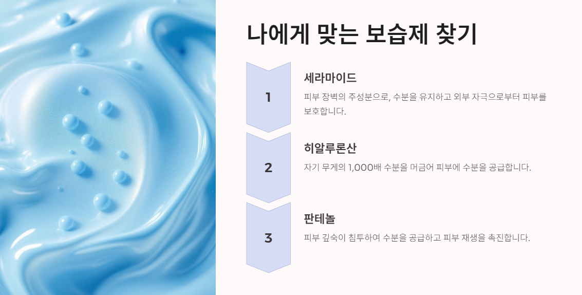 - 보습제 선택: 세라마이드, 히알루론산 등 피부 장벽 강화 성분이 함유된 보습제를 선택하여 수시로 발라줍니다.