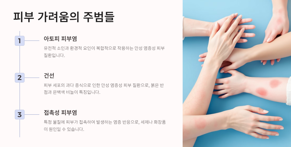 - 피부 염증 반응 유발: 건조한 피부는 쉽게 염증 반응을 일으켜 가려움을 더욱 심하게 만듭니다.