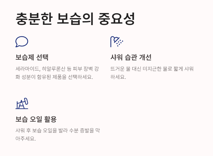 - 샤워 습관 개선: 너무 뜨거운 물로 오래 샤워하지 않고, 짧은 시간 안에 부드러운 클렌저를 사용하여 씻는 것이 좋습니다.