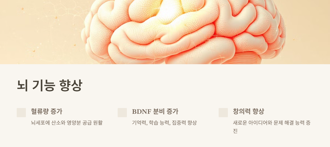- 전문가 의견: "달리기는 뇌의 해마 부피를 증가시키는 것으로 알려져 있습니다. 해마는 기억력과 학습 능력을 담당하는 중요한 부위입니다. 꾸준한 달리기는 인지 기능 저하를 예방하고 뇌 건강을 유지하는 데 도움이 됩니다."