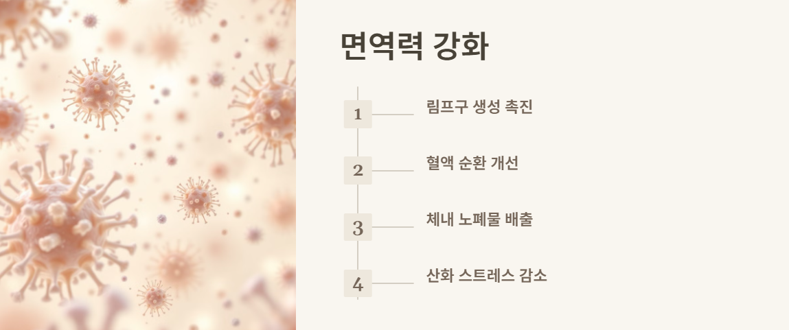 달리기를 하면 혈액 순환이 개선되고 림프구 생성이 촉진되어 면역 체계가 강화됩니다. 또한, 체내 노폐물 배출을 촉진하고 산화 스트레스를 감소시켜 질병에 대한 저항력을 높여줍니다.