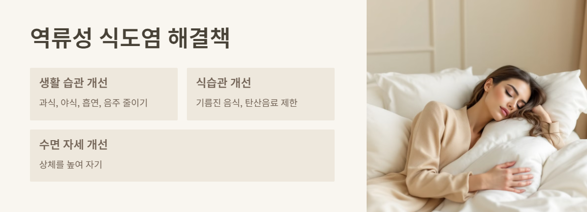 - 생활 습관 개선: 과식, 야식, 흡연, 음주, caffeine 섭취를 줄이고, 식후 바로 눕는 습관을 피합니다.