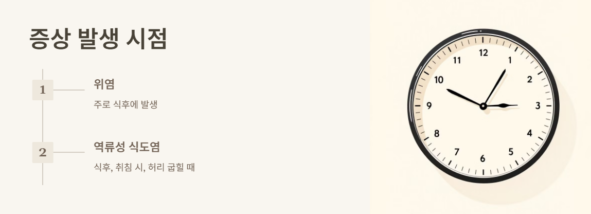 | 통증 발생 시점 | 주로 식후 | 식후, 취침 시, 허리를 굽힐 때 |