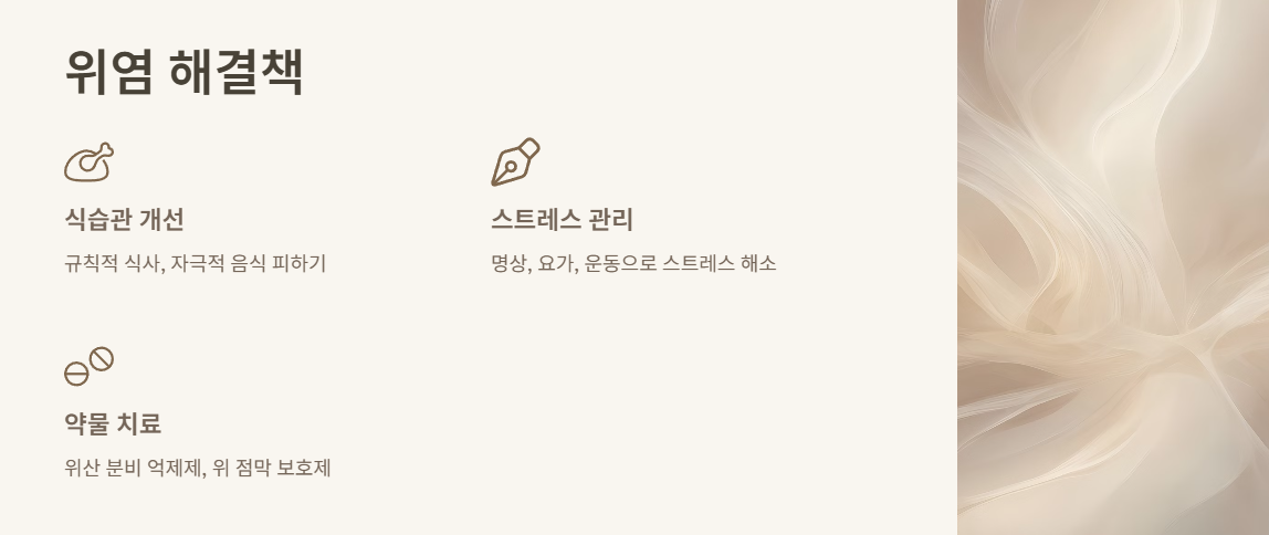 - 스트레스 관리: 스트레스는 위염을 악화시키는 요인이므로, 명상, 요가, 운동 등을 통해 스트레스를 해소합니다.